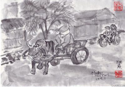 高原の朝は気持ちが良い。見た目は高原ちゃうけど高度はすこしあるようだ。ホテルは えらい派手で大きいけど周りは結構田舎感が漂っている。 スケッチブックを持ってまず右の方山手の方に行く道をブラブラしてみよう。 昨日昼飯を食った食堂やら、民家やらがぼちぼち並んでいる。 そろそろこのあたりの一日が始まろうとしてるようだ。 バイクに乗ってご出勤の若者がいる。 牛にのってご出勤のおじさんがいる。 おばさんもす … 続きを読む ベトナム、ハノイ、マイチャウ、モクチャウ高原の旅−45、モクチャウで朝の散歩。