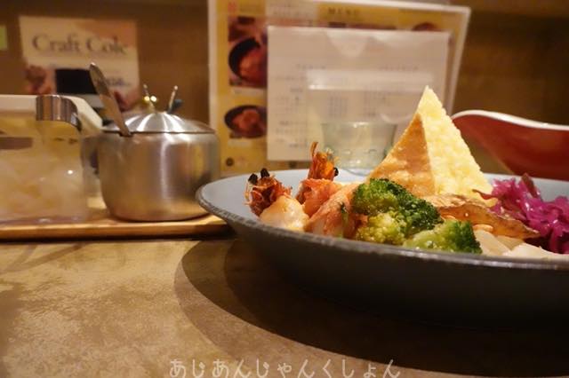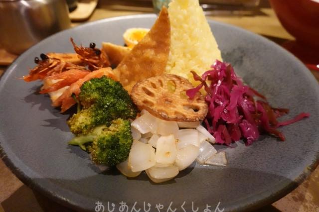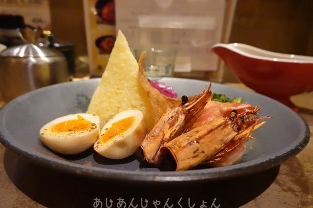 で。濃厚エビカレー。スパイス卵。ご飯少なめ。