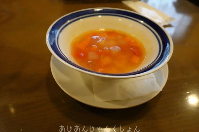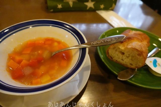 さて、キンキンに冷えた白ワインとスープ、パンから始まる。