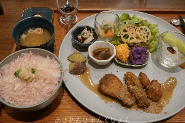 気まぐれお魚プレートを白ワインで、ごはんをわさびライスに変更。