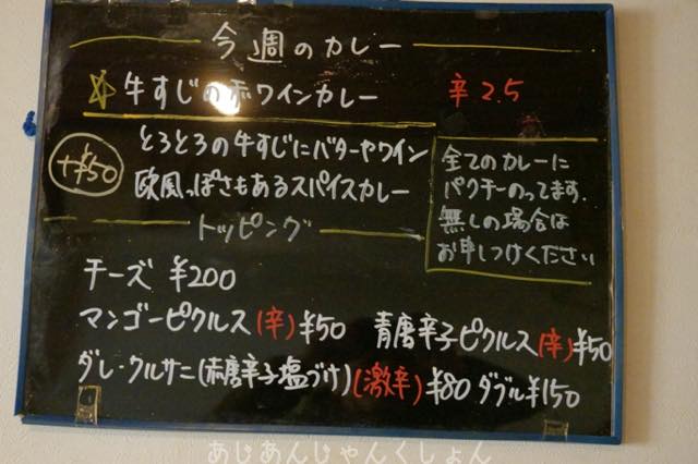 黒板メニューの「牛すじの赤ワインカレー」というのが美味しそう。