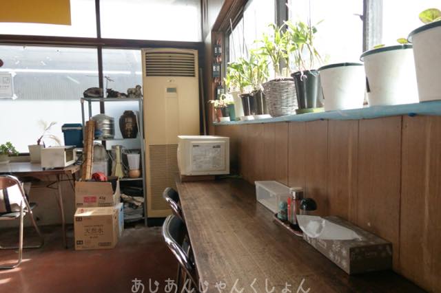 壁に向かったカウンター席と、大きいテーブル席。