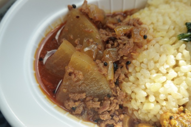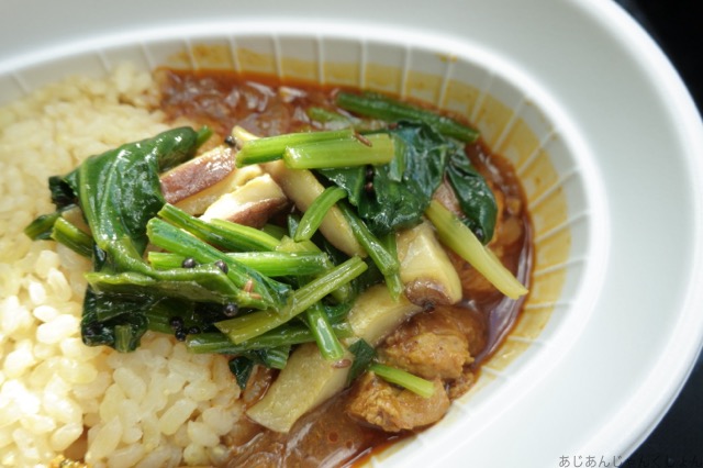 ホウレン草炒め添えチキンカレー&大根の出汁キーマを合いがけ、ご飯少なめでいただく。