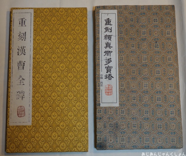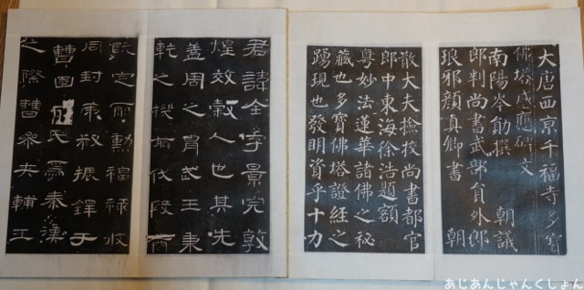 本物かどうかはわしにはわからんけど、有名な石碑の拓本が墨の香りもかぐわしく、ならんでいたりする。