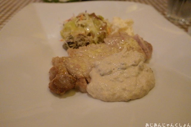 ポークソテーにツナとオリーブのクリームソース。これでなんと、800円。白ワインを追加して400円。